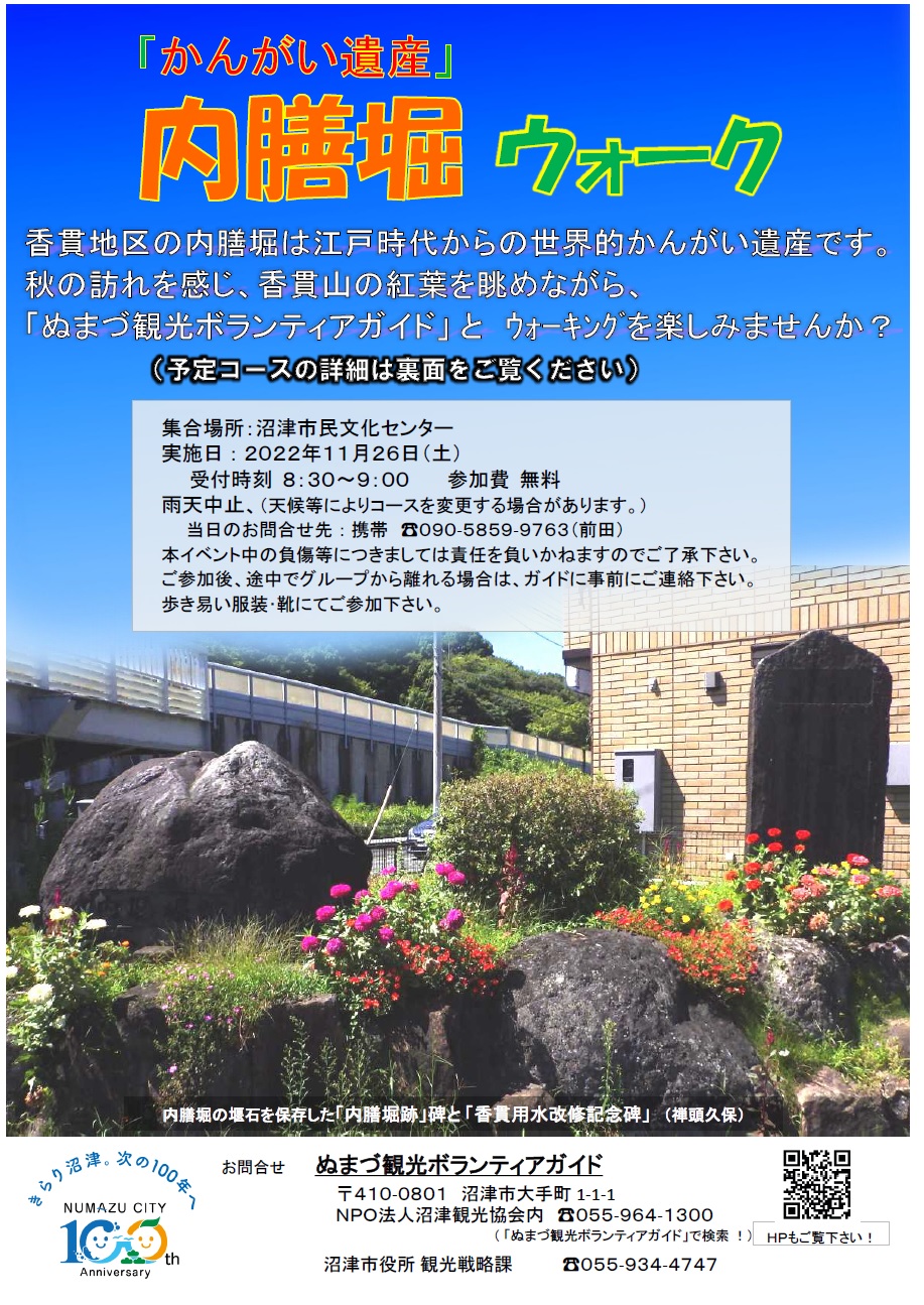 明日11月26日には、沼津が誇る観光ガイド、「ぬまづ観光ボランティアガイド」のおじいちゃん先達たちと一緒に香貫山の紅葉を見ながら内膳堀沿いを歩くウォーキングイベントが予定されています(雨天中止)。