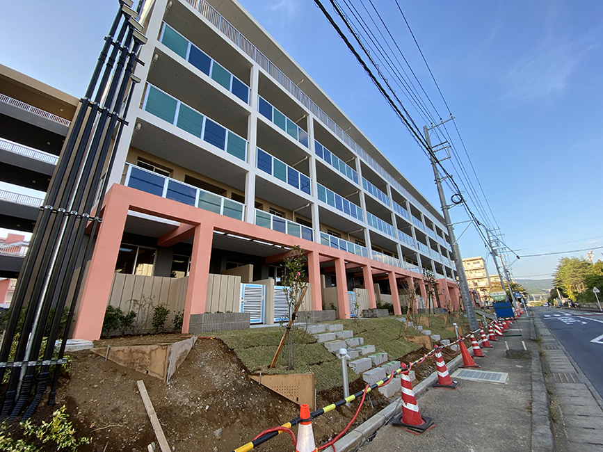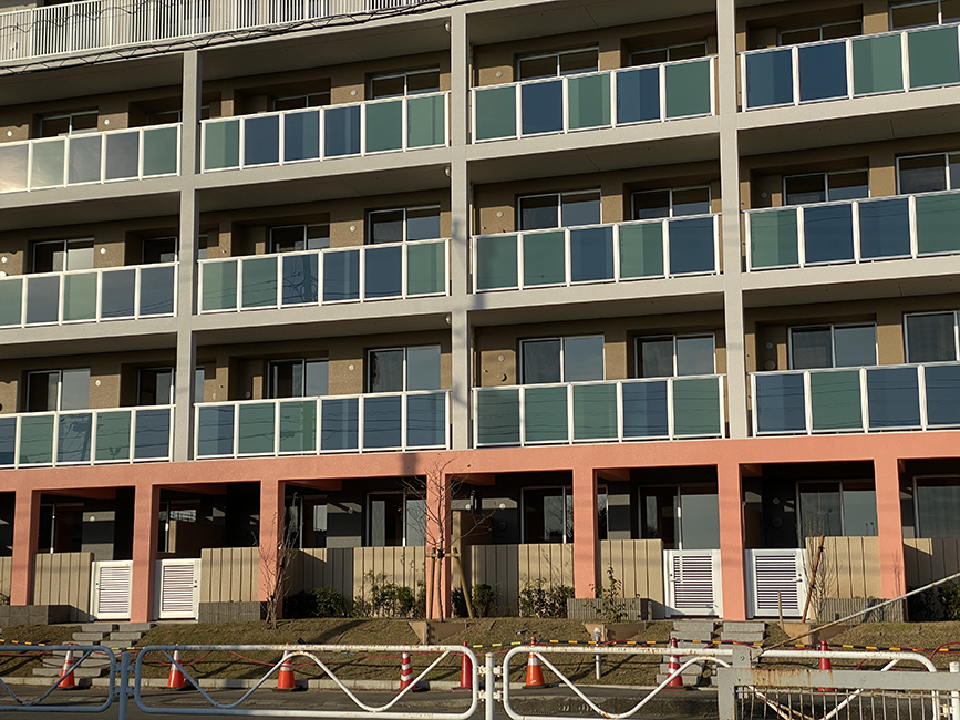 この棟は「第1工区」と呼ばれる部分で、 完成予定は今年の11月ごろ。もうすぐですね。建替前の古い棟はすでに解体され、 今後は第2工区の工事も順次進む予定。新しい棟の外観は、淡いグレーとベージュを基調に、バルコニーがブルーグラデーション。空の色とつながるようなデザインで、めっちゃ爽やかですねー。