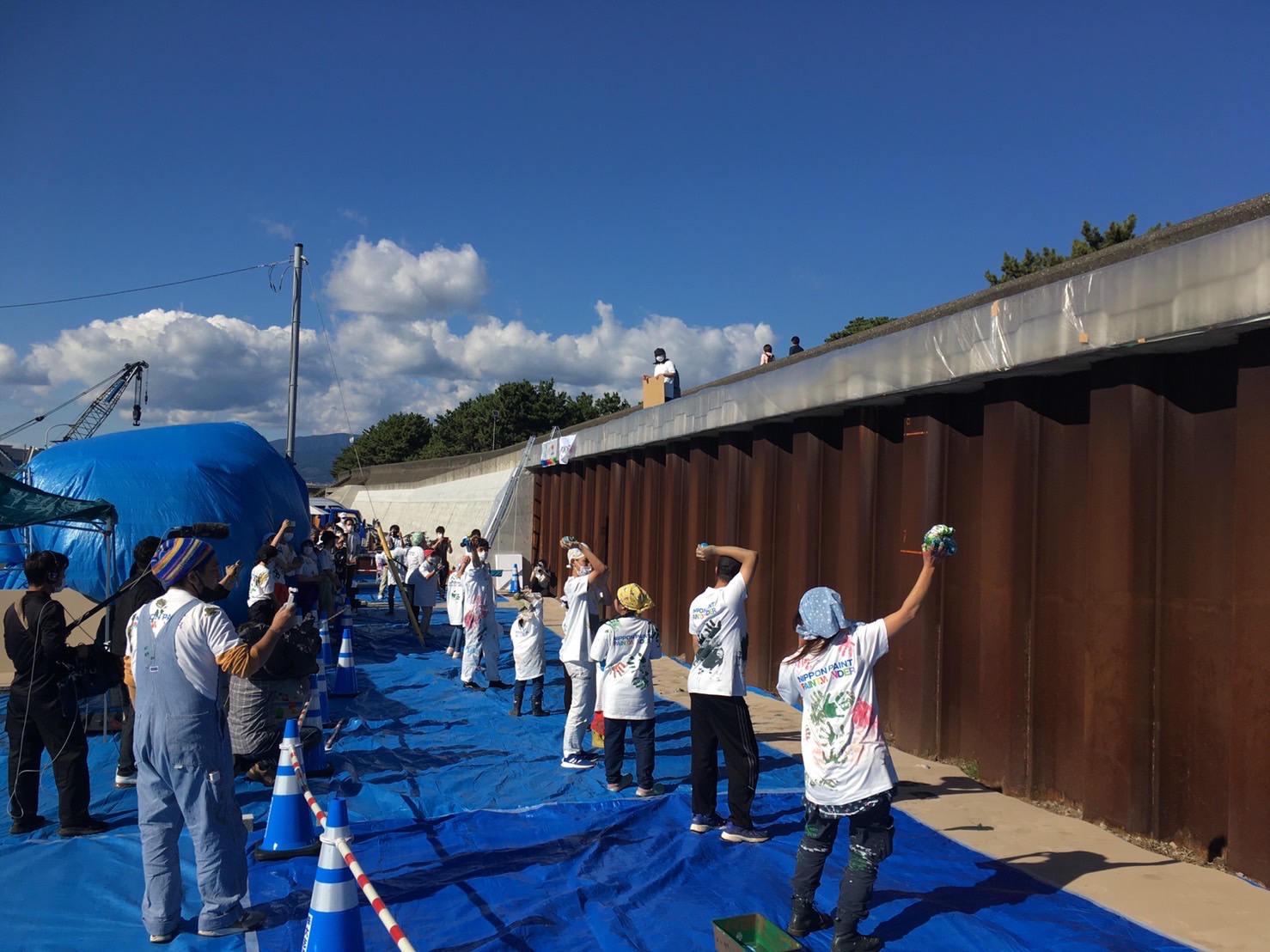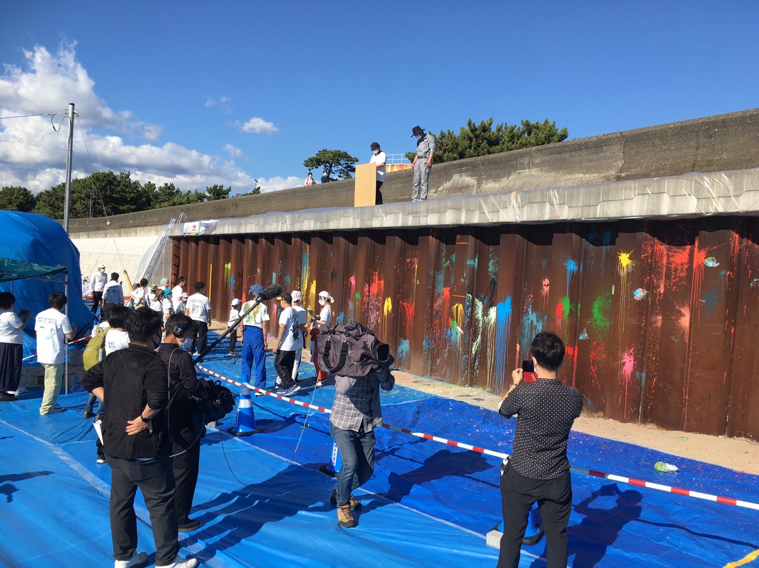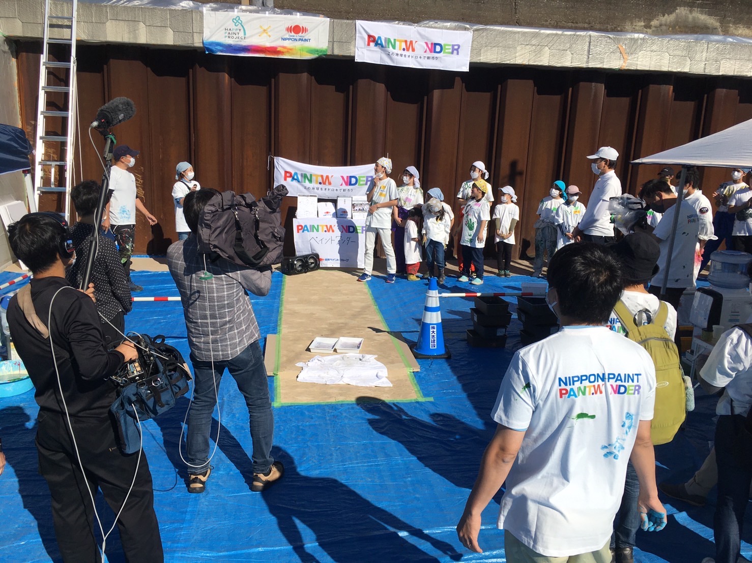 跳ね返ってくるペンキから逃げるテレビの方々。