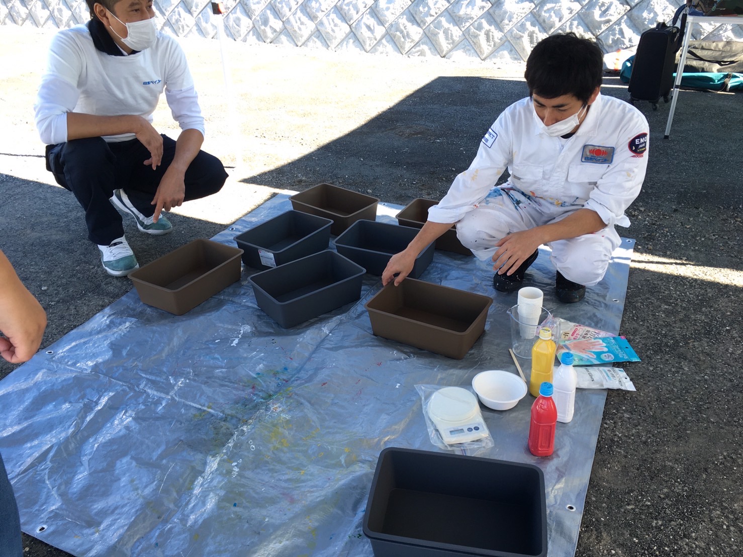 許可されたところ以外に飛び散らないように頑張る大人。