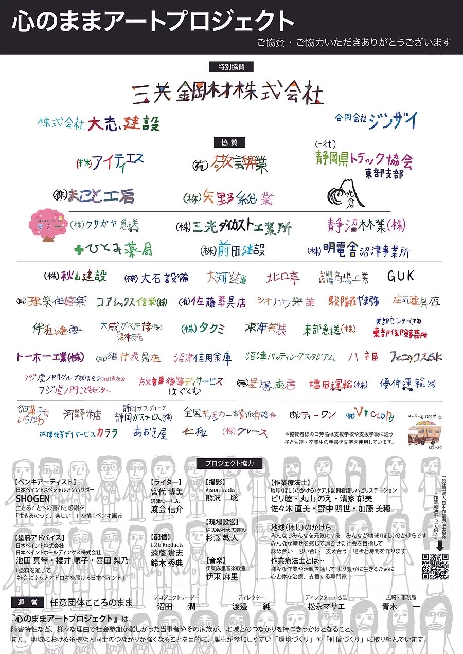 心のままアートプロジェクトとは、「アートを通じて地域とつながる・地域をつなげる」を合言葉に、誰もが参加しやすい環境をつくることで、普段は混ざり合わない“人と人”“場所と場所”をつなげるプロジェクトです。障害を抱える方とその家族が地域社会との関わりを深めるきっかけとなること、地域における多様な人同士のつながりが強まること、笑顔あふれる支え合いの輪が広がることを願っています。 by こころのまま