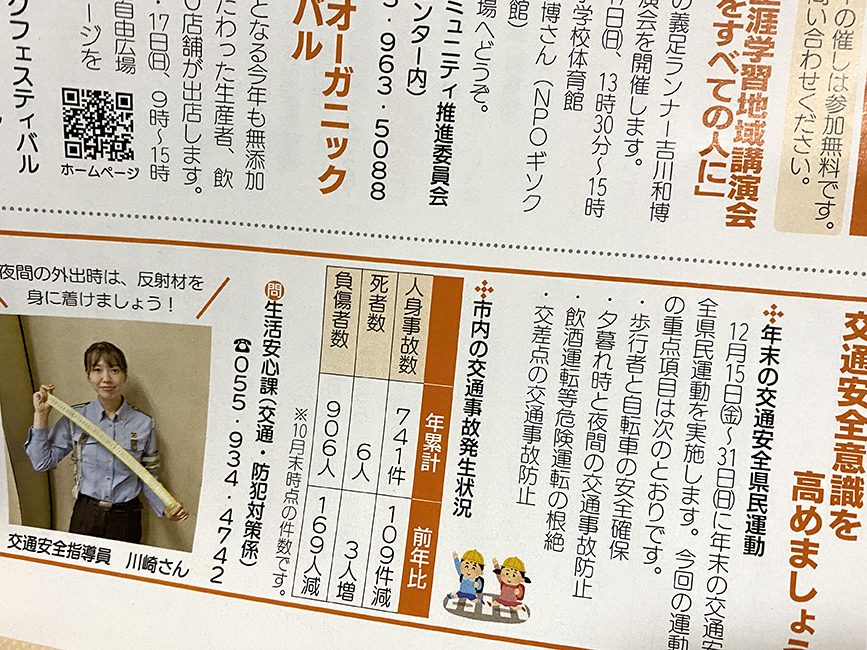 最近、情報ひろばの最後に沼津警察署からのお知らせが載ってる。今回は交通安全の話題。沼津警察署管内では人身事故は減っているものの、死亡事故は増えているようです。冬は暗くなるのが早いので、交通安全にはより気をつけたいですね。