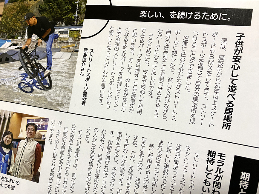 しまやん@ぬまつーはストリートスポーツ愛好家の渡会信介さんとして登場してる。なんかいいコトいってるんで、ぜひ広報ぬまづを読んでみてね。