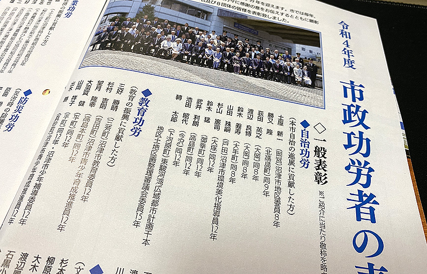 続いて教育とか文化とか、いろんな分野で沼津市のためにがんばった人「市政功労者」の表彰。こういうのって知ってる人の名前を探しがち。
