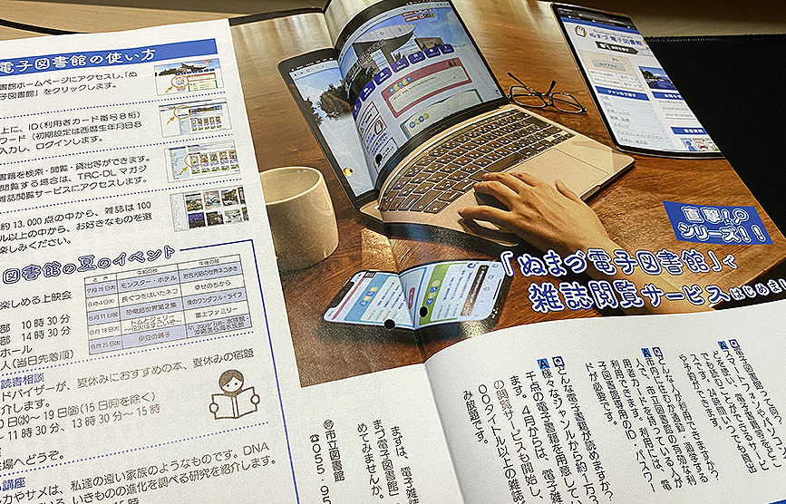 さっそくなかを開いてみると、「ぬまづ電子図書館」で雑誌の閲覧サービスがはじまったよ!というニュース。図書館の夏の催しも掲載されています。どうでもいいけど、写真に映ってるデスクがめちゃデカいww