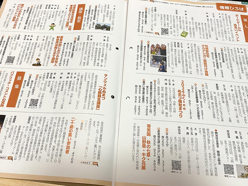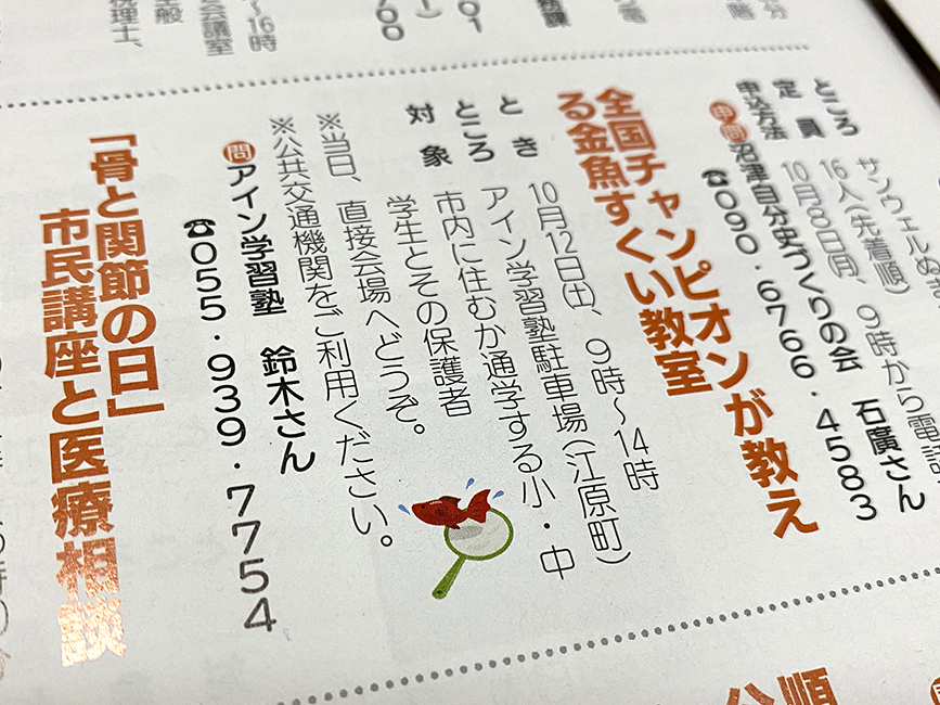 市からのお知らせではなく、民間団体からのイベント情報「市民伝言板」では、なんとも気になる「全国チャンピオンが教える金魚すくい講座」。金魚すくいにもチャンピオンとかいるんですねえ。こちらは10月12日に開催だそうです。詳細は広報ぬまづをじっくり読んでみましょうね。