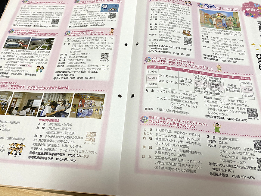 続いては見開きまるまる子育てに関する話題。イベント情報ももりだくさんで、子育て中でなくてもワクワクしてきますね。
