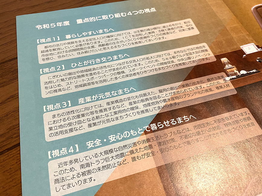 さて、広報ぬまづ4月1日号は、毎年その年度の「施政方針」が紹介されています。細かいこともいっぱい書いてありますが、重点的に取り組む4つの視点は覚えておいて損はなさそう(ホームページでは全文読めるみたい)。