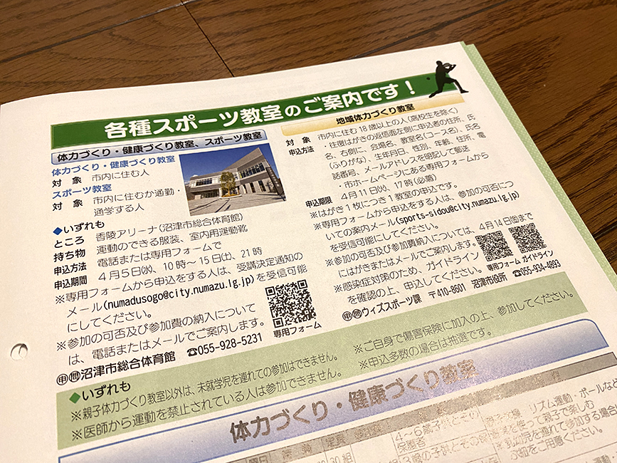 各種スポーツ教室や地域で開催される体力づくり教室がズラリ。新しい体育館(香陵アリーナ)でやる教室もあるみたい。