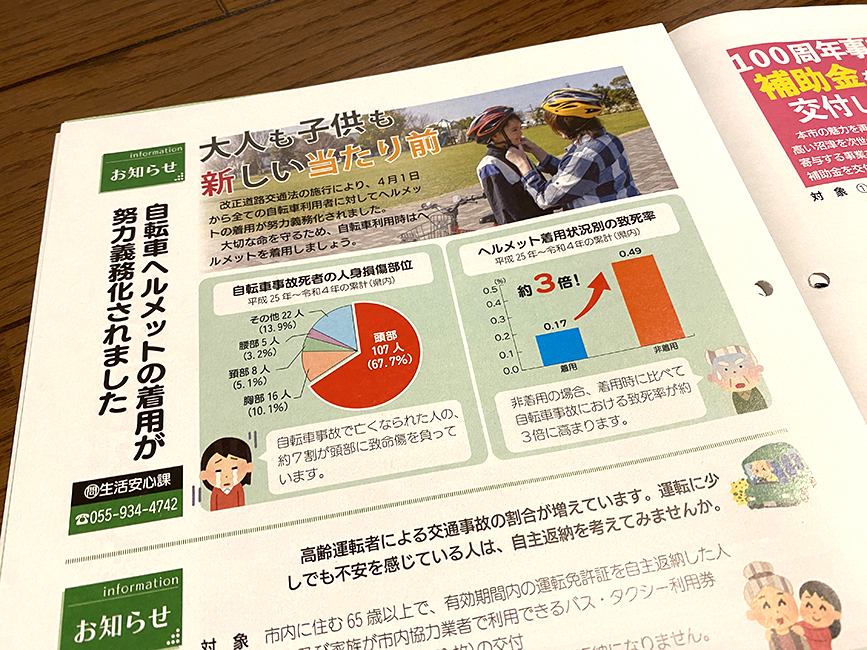 見開きページでは100周年記念事業をやりたい人をサポートしちゃうぞ!という補助金のお知らせに、なにかと話題の自転車ヘルメットの努力義務化のお知らせなど。