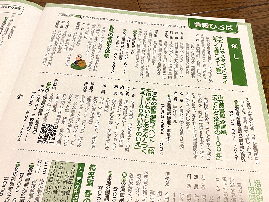 年度替わりということで、広報ぬまづもベースカラーがオレンジから緑に衣替えしています。情報ひろばも緑一色になって、様々な催しの情報などが掲載されています。