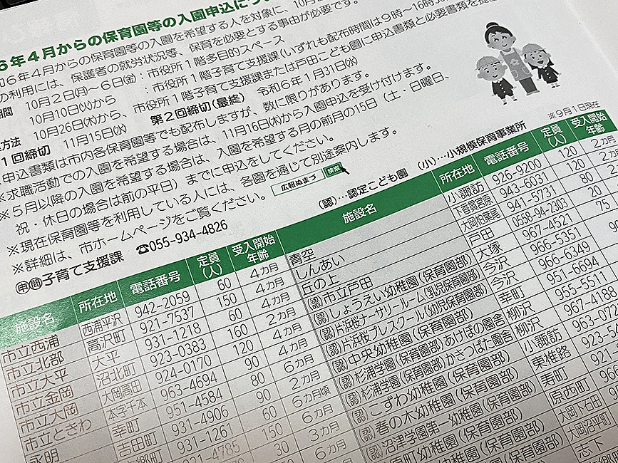 子育てページは、保育園とか幼稚園の入園案内に大部分を使っています。沼津市内って高校が多いイメージでしたが、幼稚園とか保育園も結構たくさんあるのね。ぬまつーでも一時期流行った「どこ中?」は沼津市民の定番フレーズですが、「どこヨウ?どこホイ?」なんてのもあるんでしょうか。原ひろし@ぬまつーは原町幼稚園出身。