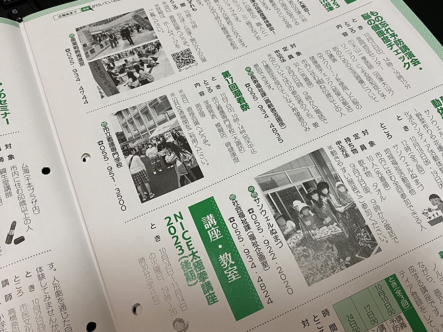 続いての見開きは、「にぎわいあふれるスポーツのまち」についての話題。ここの右上の【スポーツ】ってくくりは始めてみました。ちなみに、通常は【催し】【講座・教室】【お知らせ】なんかがあるみたい。