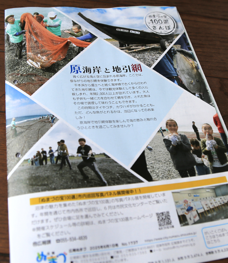 いちばん最後のページ、ぬまづの宝100選さんぽも海に関する話題。原海岸の地引網が紹介されています。原ひろし@ぬまつーが子どもの頃に比べたら随分見る機会、やる機会が減った感はありますが、広報ぬまづに載ってるキッズたちはいい笑顔で楽しんでいるようです。