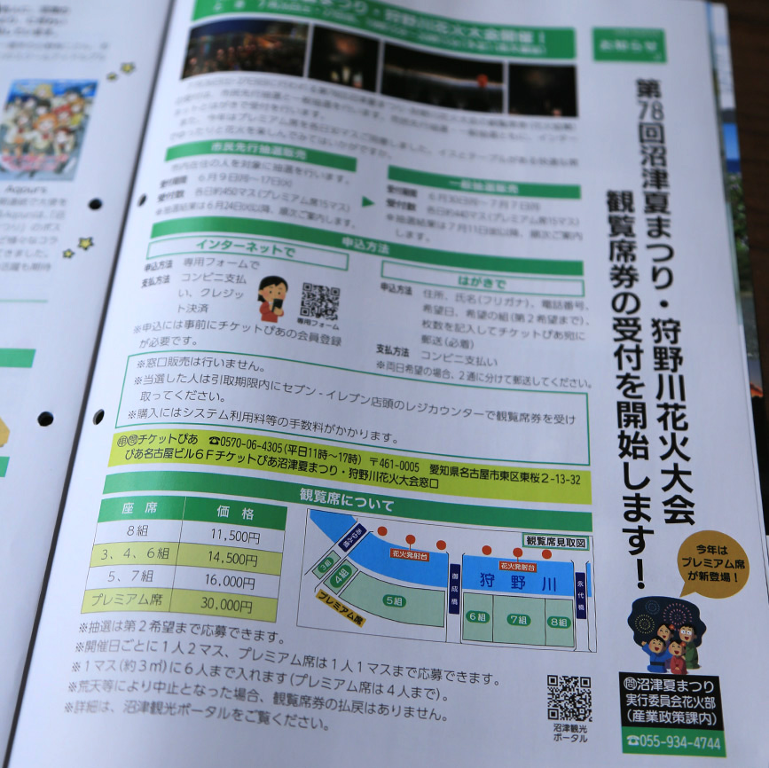 ページをめくっていくと、ついに来ました夏まつりの桟敷席(観覧席)の予約のニュース。なんと今回からプレミアム席(30,000円)が登場!他の席も微妙に値上がりしているようですが、似たような規模の花火大会をみると通常の席で15,000円とか、VIP席10万円とかもあるから、狩野川花火大会はわりと良心的な値段なのかもしれません。