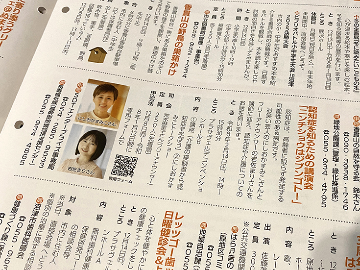 5ページにわたる情報ひろば。こちらもイベントや講座などの情報がてんこ盛り。これまたぬまつーでも紹介したにしおかすみこさんが沼津にやってくる認知症のトークイベントも掲載されています。いろんな情報をくまなくチェックしたいですね。