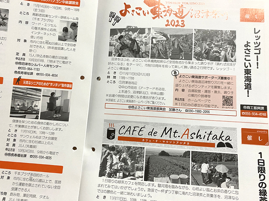 ページをめくると秋のイベント案内。よさこい東海道や緑茶カフェなんかが開催されるみたい。他にはシニア向けの情報が多め。