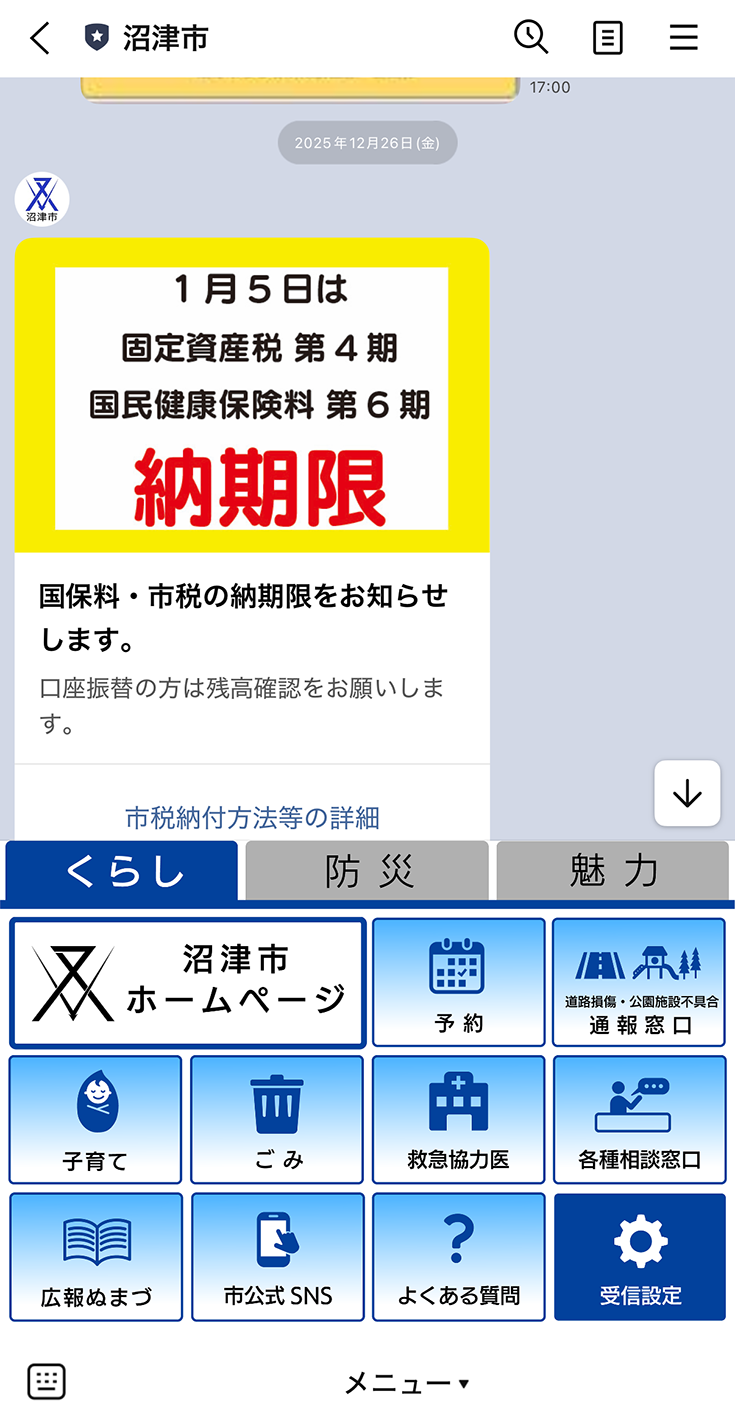 ちょっと前から、機能がパワーアップしてて、「受信設定」をすると欲しい情報だけ受け取ることができるようになっています。ごみ収集日のお知らせや子育て支援、観光イベントなど、自分が関心のあるカテゴリだけ選ぶことができるんそうです。全受信にしておくと1日3回くらい通知が来るので煩わしいと思う人にも優しいですね(設定はいつでも変えられるみたい)。