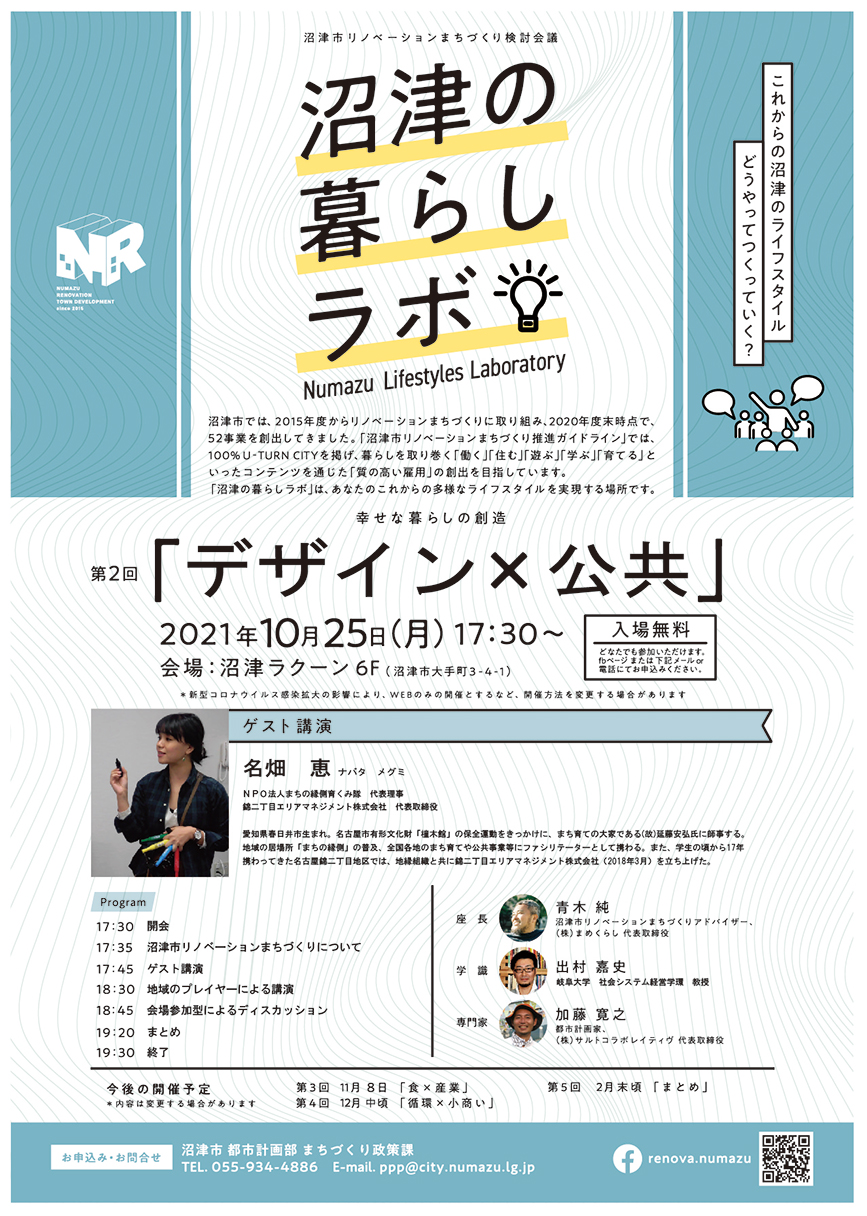 お問合せ・申込みは沼津市まちづくり政策課、電話055-934-4886、メールアドレスppp@city.numazu.lg.jp。またはリノベーションまちづくりのFacebookページからどうぞ。