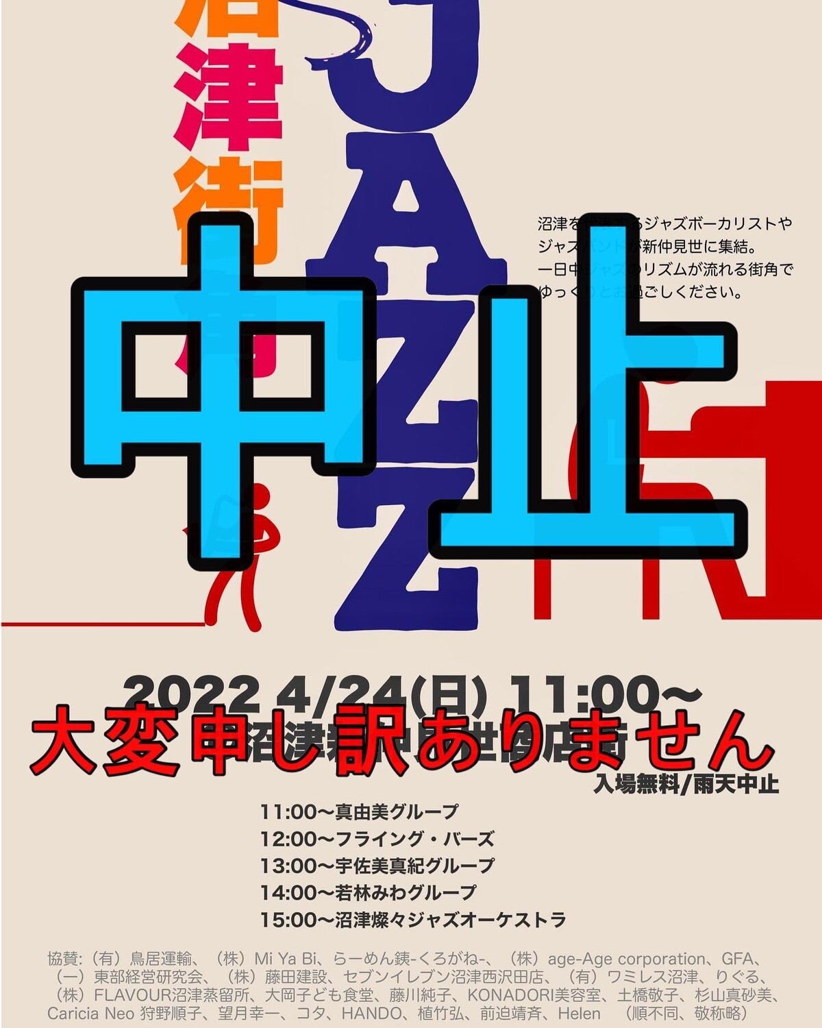 楽しみにしていた皆さま、大変申し訳ありません。本日予定しておりました「沼津街角JAZZ」は雨天のため中止となりました。