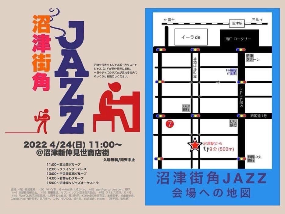 【速報】雨のため中止。きょう4/24(日)沼津街角JAZZ。次回がたのしみ。沼津新仲見世商店街