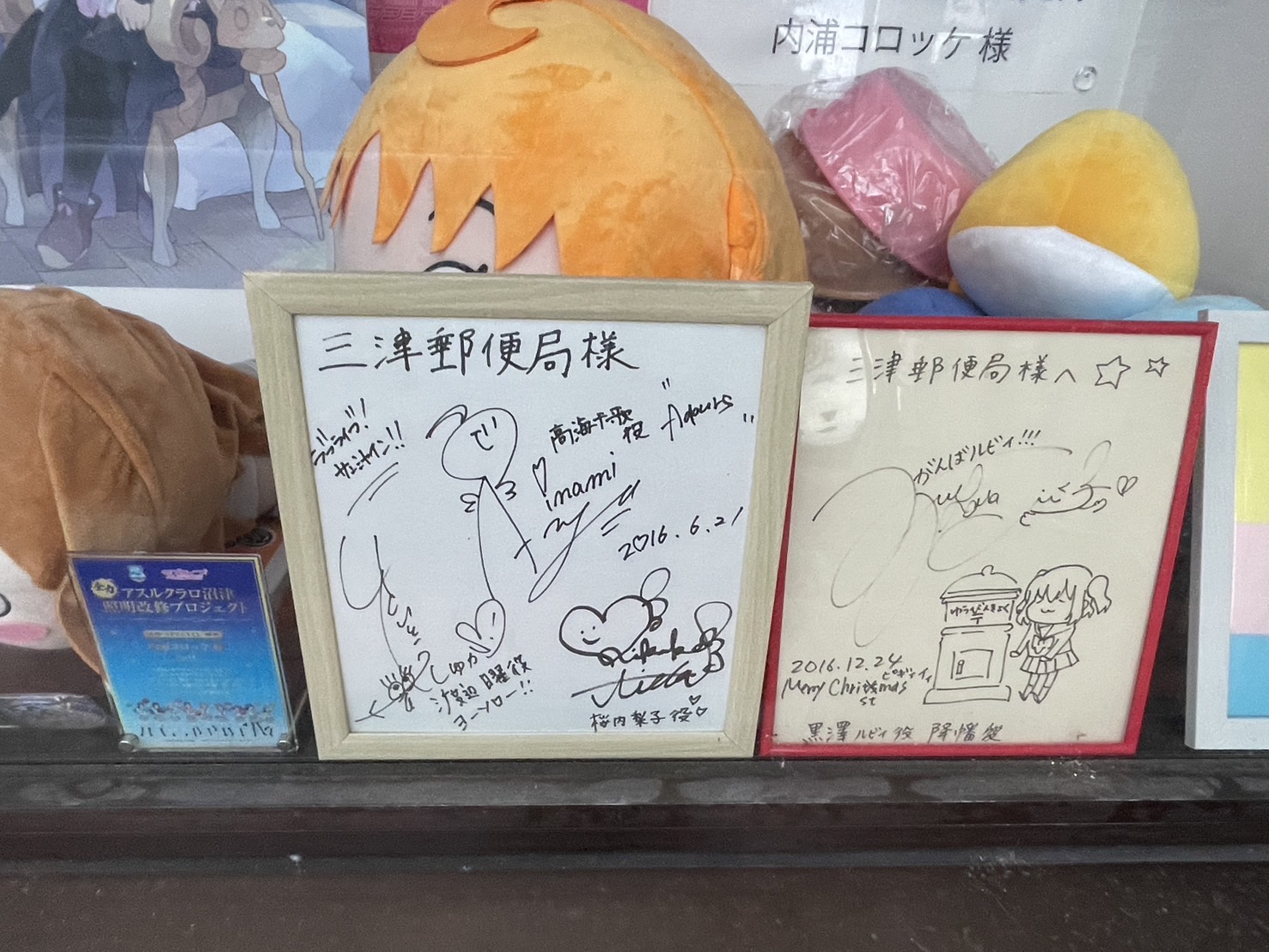 三津郵便局。サインとかが展示されているってことは、全国から多くのファンが訪れる場所なのかな・・・。アスルとラブライブが好きなゆーま@ぬまつーに、こんど聞いてみようっと。