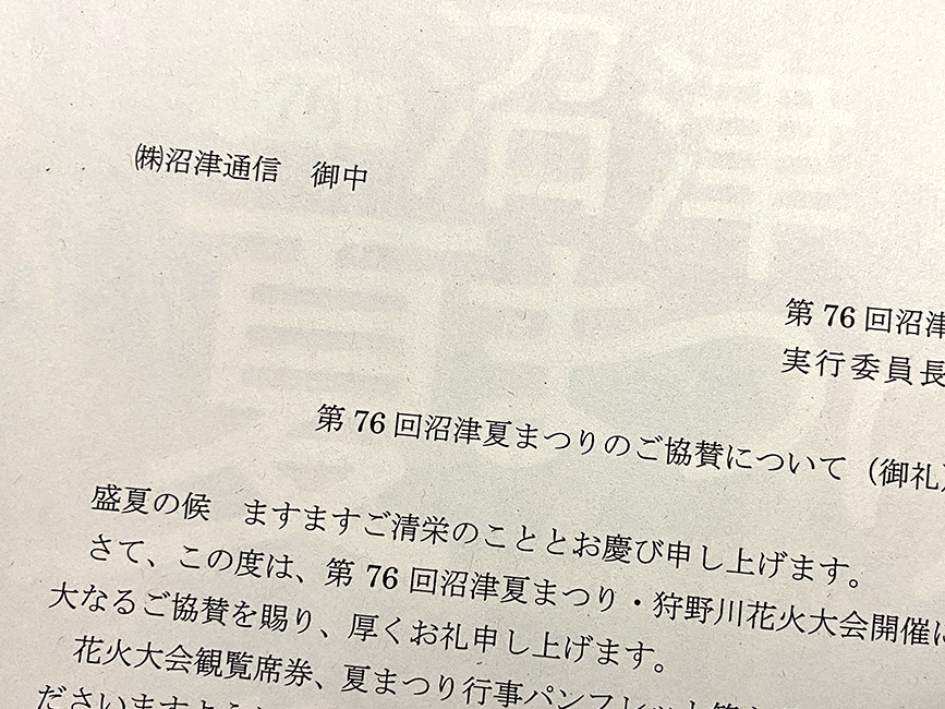 ぬまつーでは沼津市制100周年の記念すべき花火大会にささやかながら花火協賛させていただいたため、御礼のお手紙と第76回沼津夏まつり・狩野川花火大会のパンフレットが入れられています。