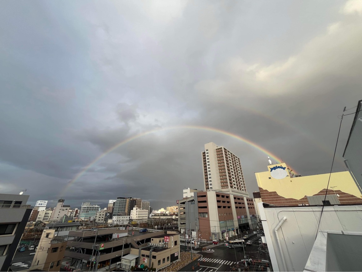 沼津駅をふわーっと囲んでる虹。めっちゃきれい。