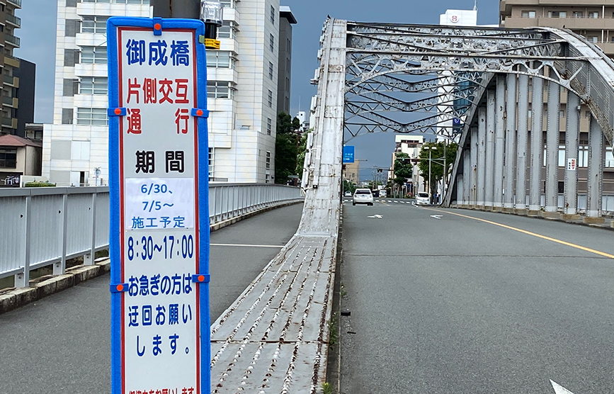 御成橋が片側通行。お急ぎの場合は迂回を!6月30日~7月5日。