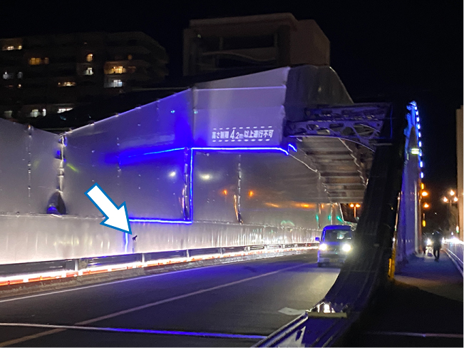 現在工事中の御成橋。高さ制限は4.2m。夜にだけ出現する標示がなんかかっこいい。