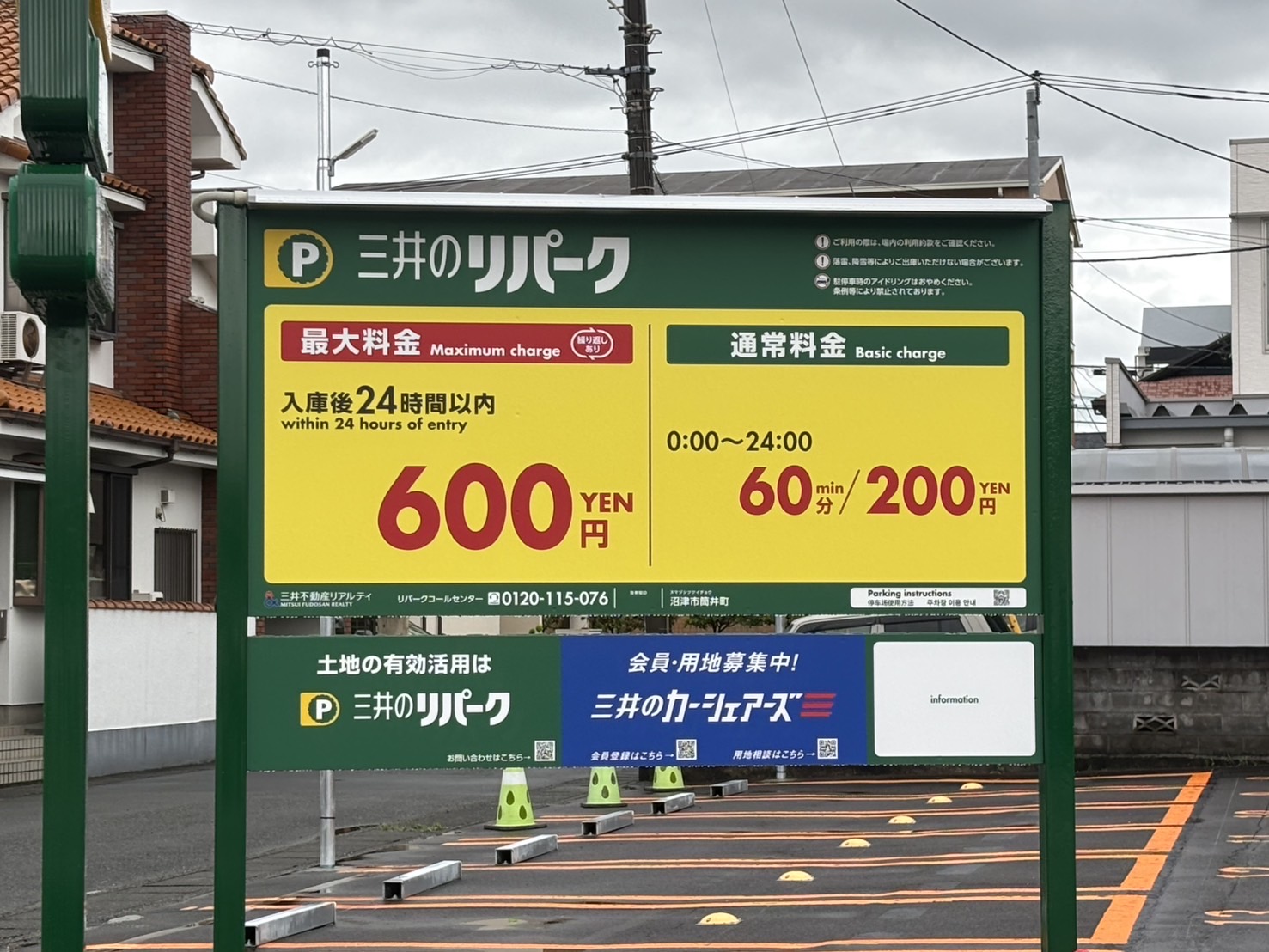 三井のリパーク。入庫後24時間以内600円。60分200円。だそう。