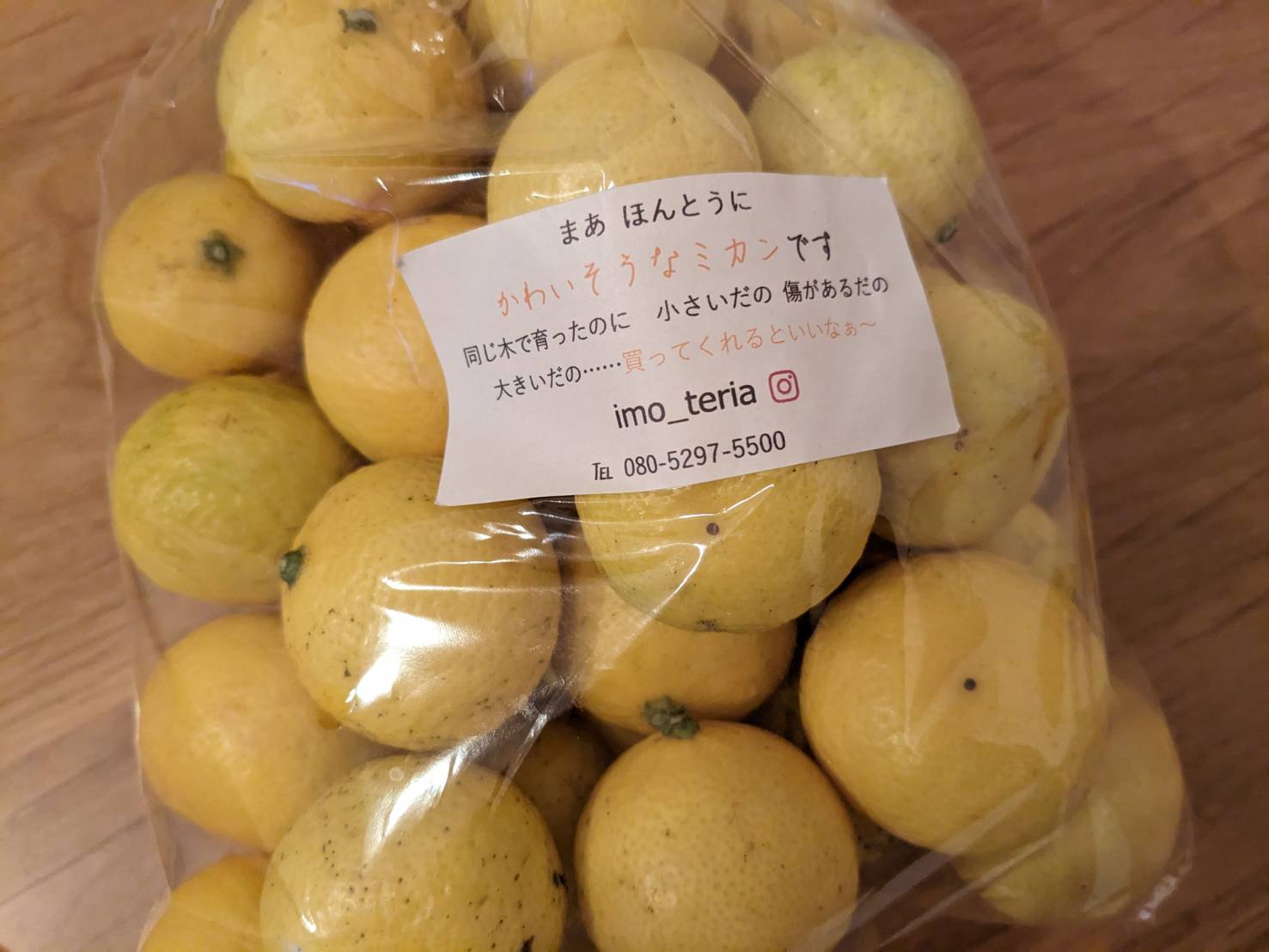 この前、お散歩中に石焼き芋とか柑橘類とかレトロ雑貨を売ってる「イモテリア」さんでこんなに可愛らしい黄金柑の詰め合わせを見つけました。第二小学校の近くにある。