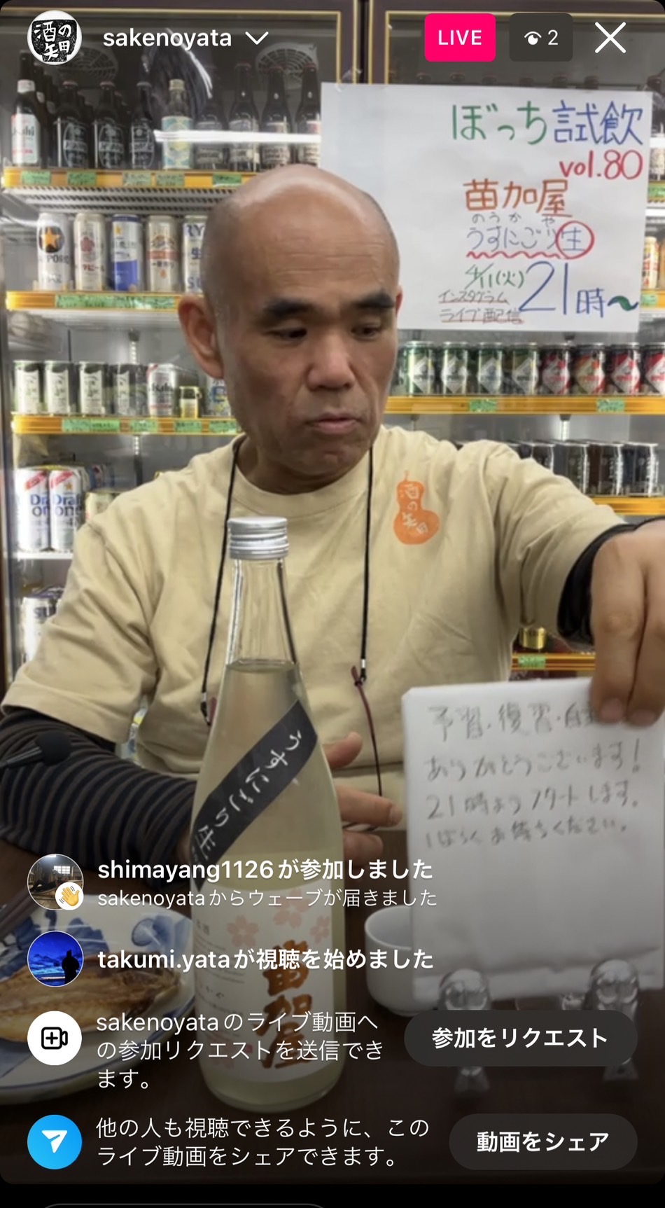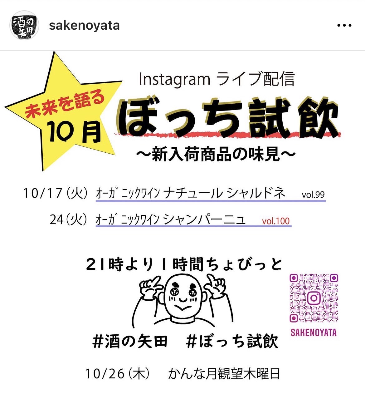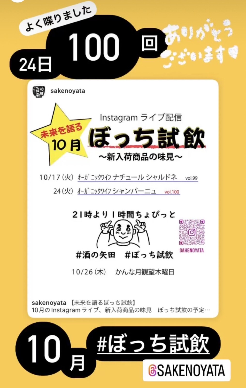 100回記念。あす24(火)は岡宮にある酒の矢田ライブ配信「ぼっち試飲」に突撃するかも。