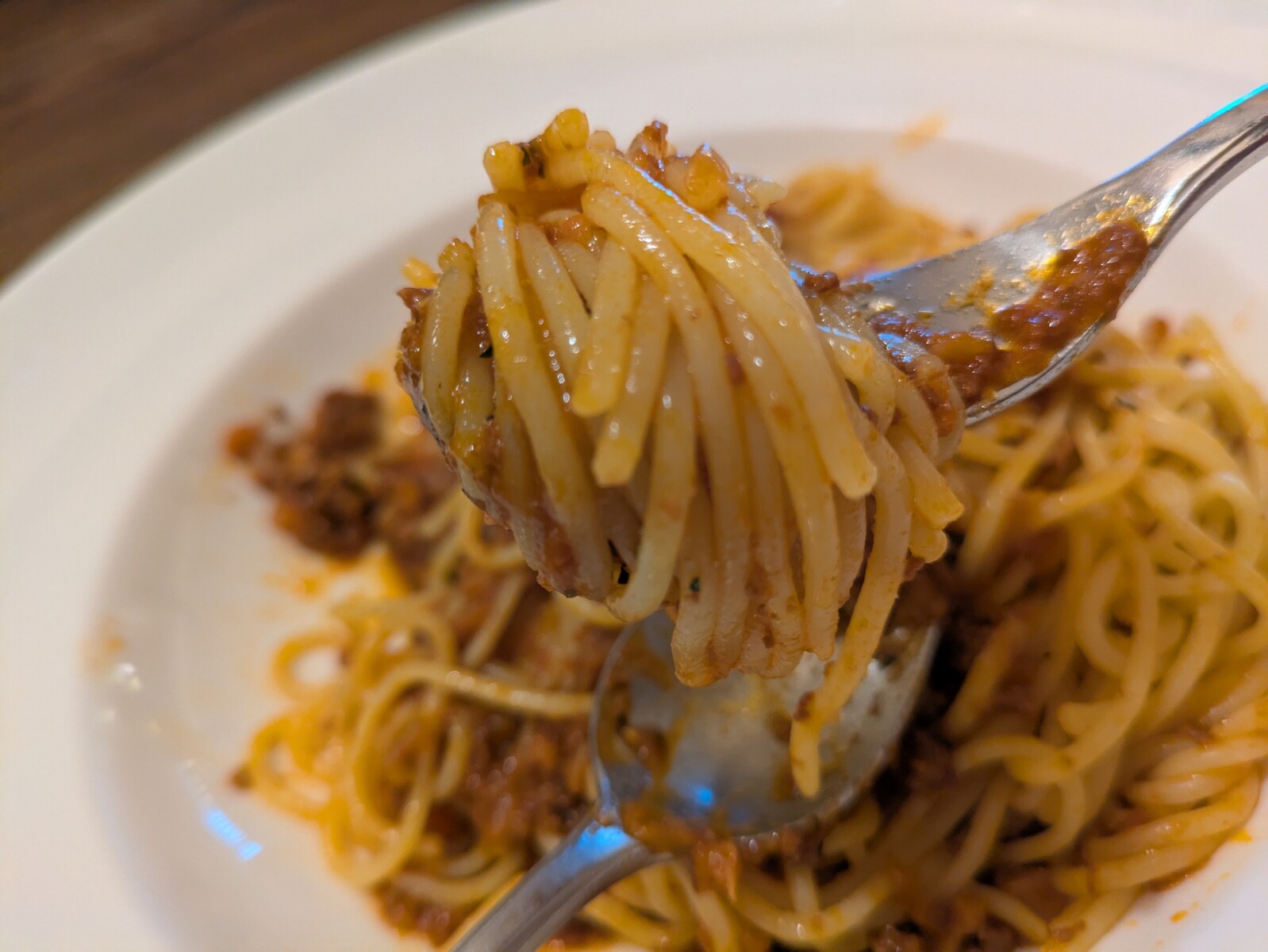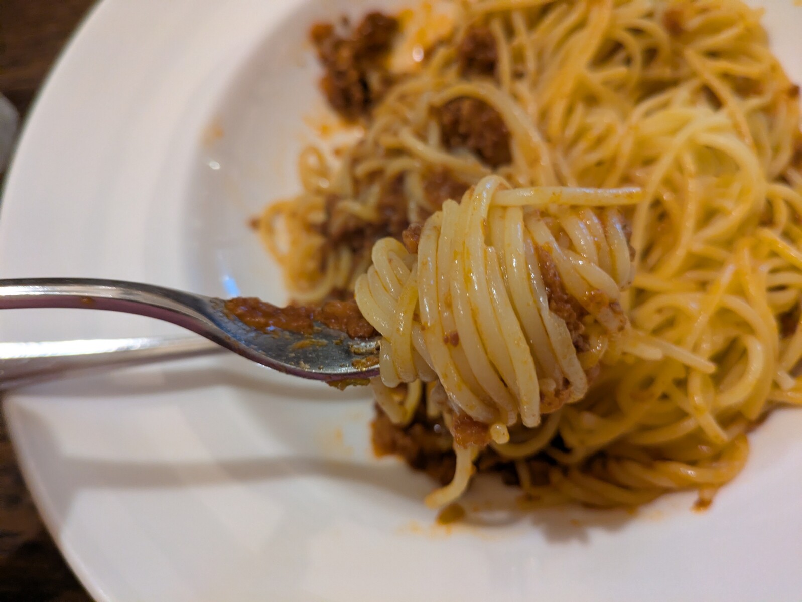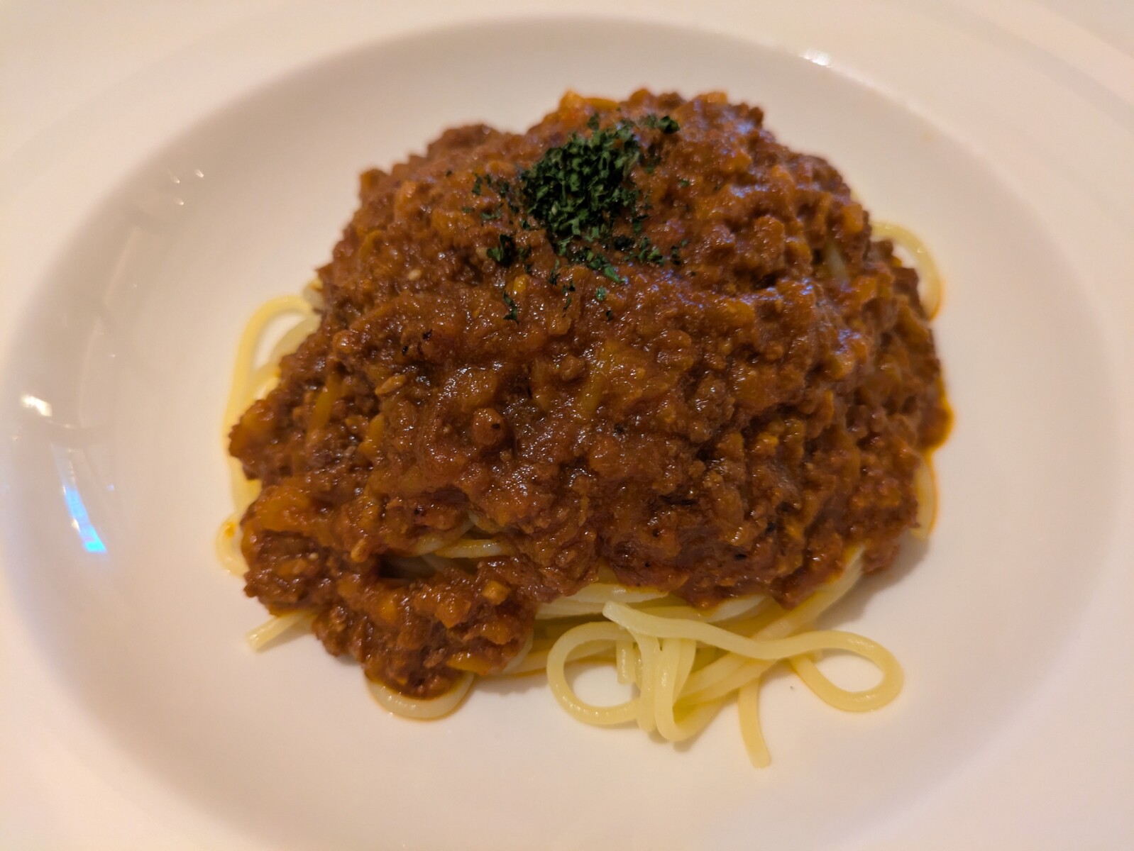 スパゲッティの王道、ミートソース。ソースがもりもりのっています。