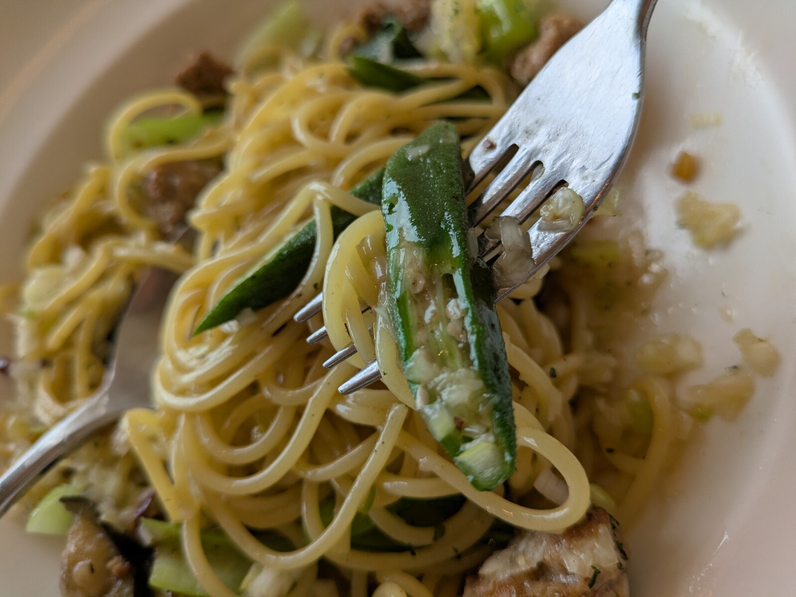 下の方からオクラもでてきた。食べているうちに次々といろんな野菜が掘り起こされて、幸せのパスタでした。