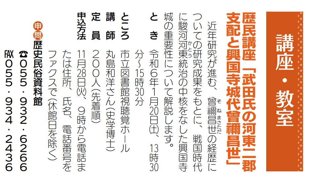 開催日時は1月20日の13時30分から15時30分。開場は市立図書館の視聴覚ホールとなっています。定員は200人(先着順)となりますので、歴史好きの人は11月28日の9時から歴史民俗資料館(055-932-6266)に申し込んでみましょう!