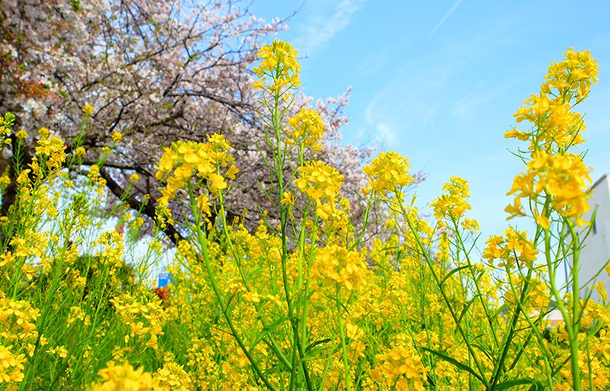 例年、菜の花の黄色との共演がきれいなのですが、今年は菜の花はやや少なめ(写真は過去のもの)。