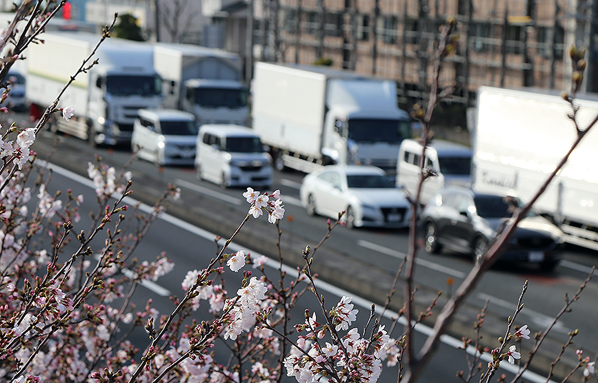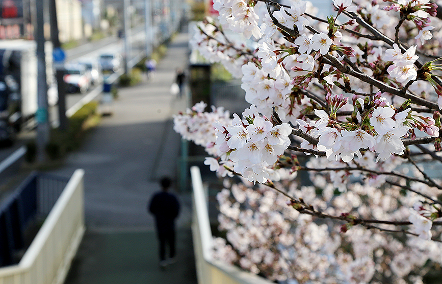 国道一号、原東町交差点あたりの歩道橋にのぼれば、桜を上から眺めることができます。