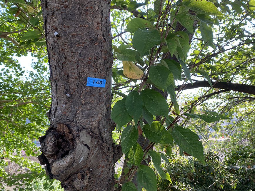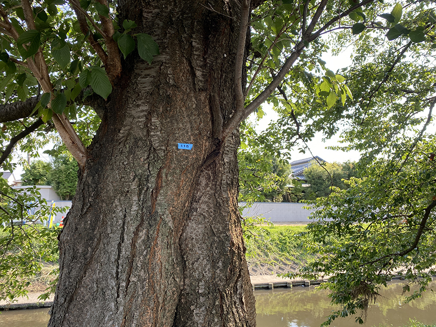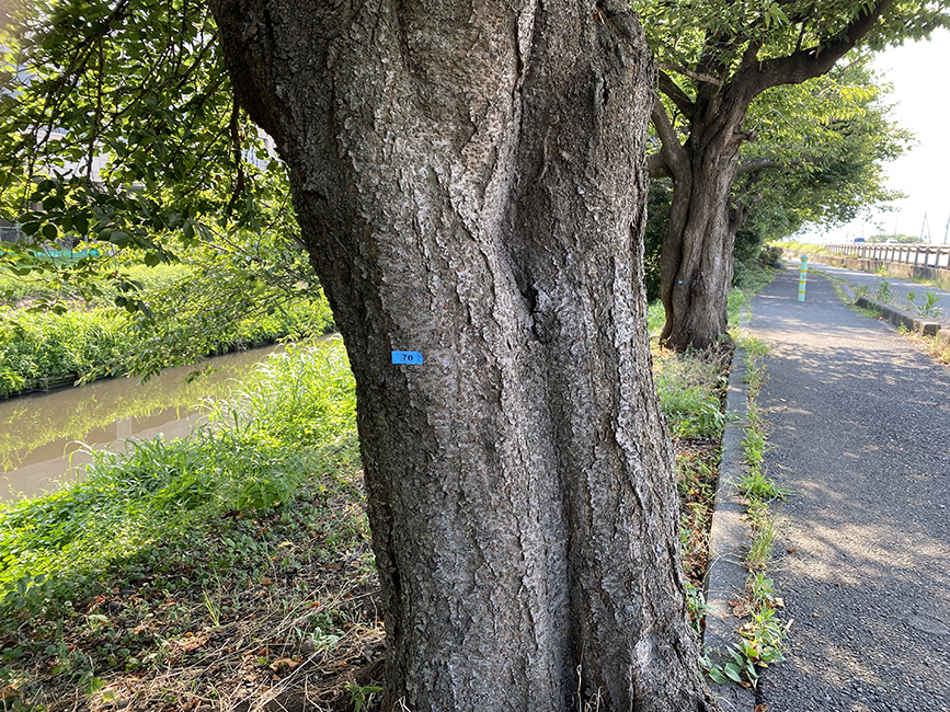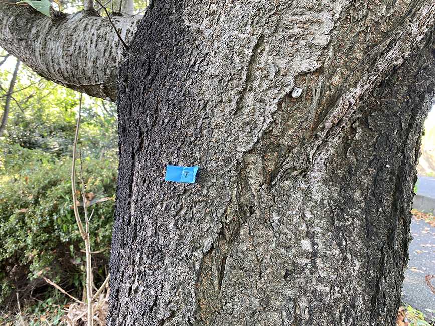 そんな桜の木、国道1号線、西添町のあたりから番号が振られた青いシールが貼られています。