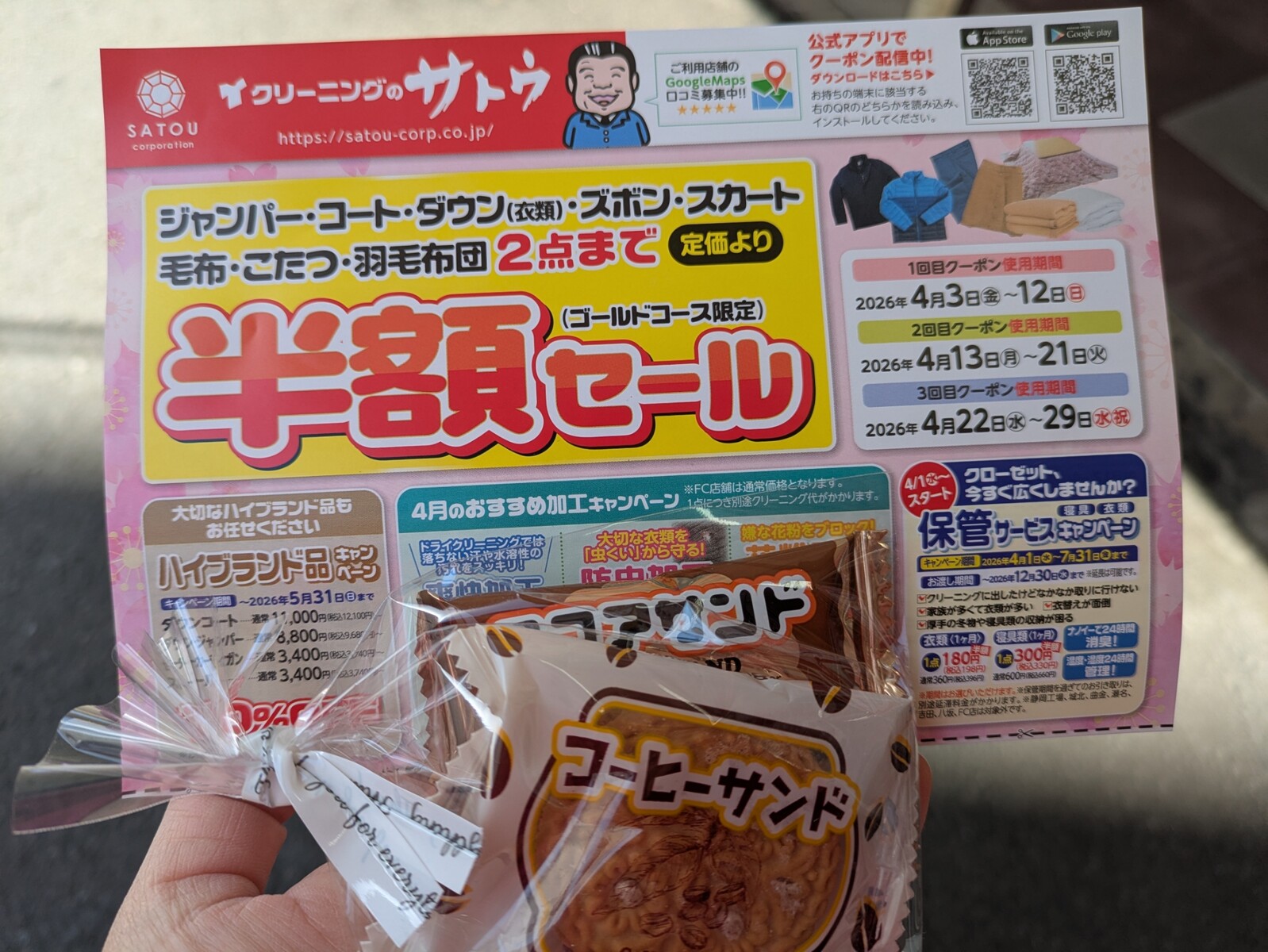ということで、クリーニングのサトウさんに、コートを預けに行きました。