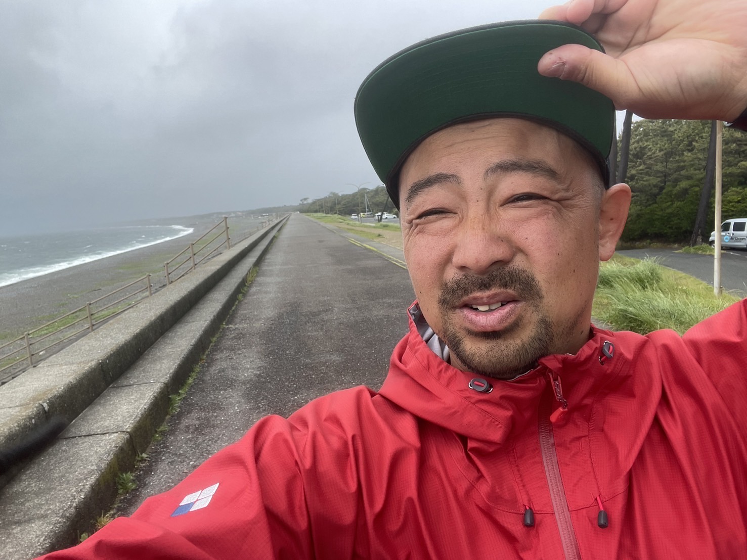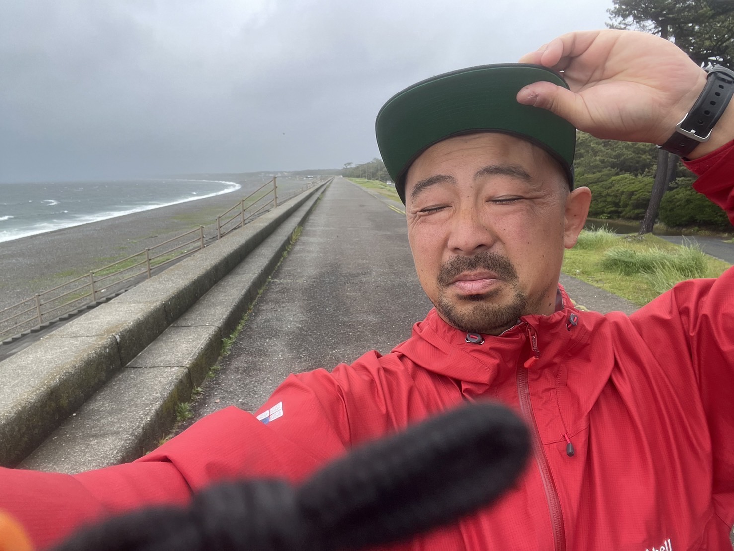 強風で小雨と波しぶきが口に入って、ちょっとしょっぱい。帽子が飛ばされそう。ゴールデンウィーク中は、千本浜からの駿河湾と富士山を見る観光客で混んでたんだろうけど、