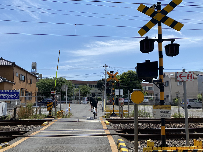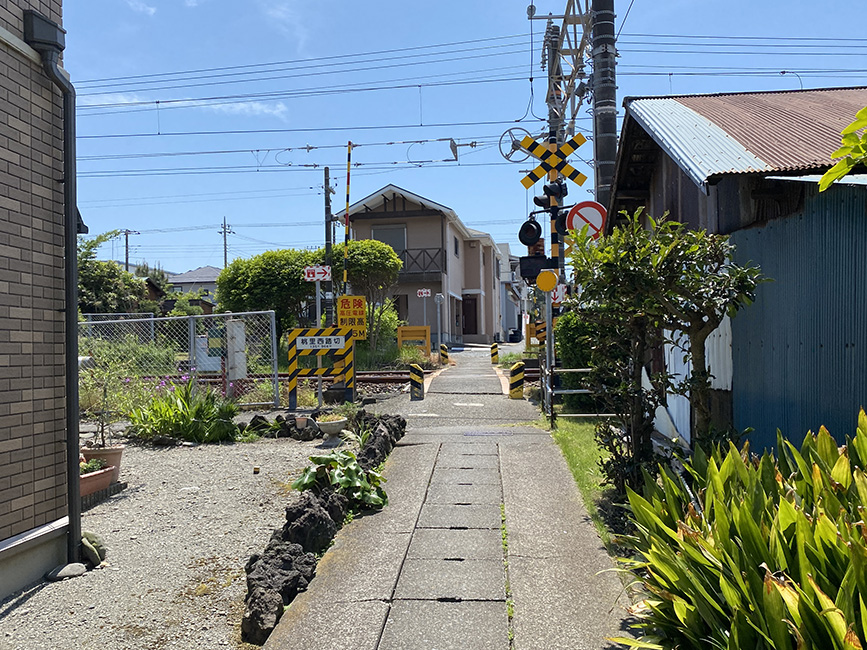2個めは旧東海道と交差するメジャーな踏切「植田踏切」。車のすれ違いもできますが、譲り合いが肝心です。