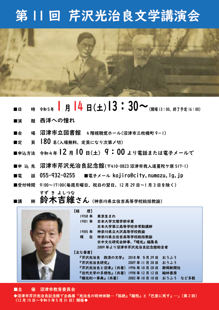 申込先は沼津市芹沢光治良記念館(電話:055-932-0255、メール:kojiro@city.numazu.lg.jp)まで。詳細はこちらをご覧ください。