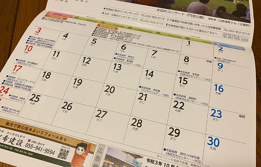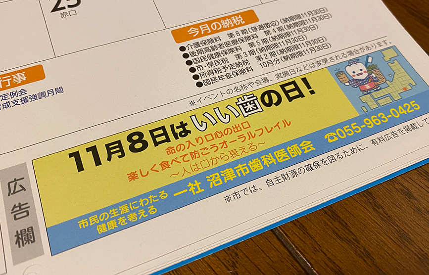 沼津市の80,000世帯以上に届けられる沼津市市民カレンダー。現在写真を募集中のようです。また、同時に1月あたり2枠ずつある広告枠も募集しているそう。1枠5万円。高いと思うか安いと思うかはあなた次第。