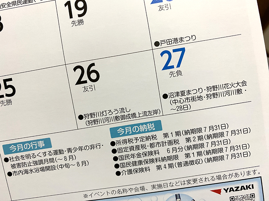 例年、市民カレンダーが届いてすぐにやる「儀式」といえば…今年の夏まつり・狩野川花火大会の開催日の確認。今年も7月の最終土曜日・日曜日にやるっぽい。わかっていても嬉しいですね。