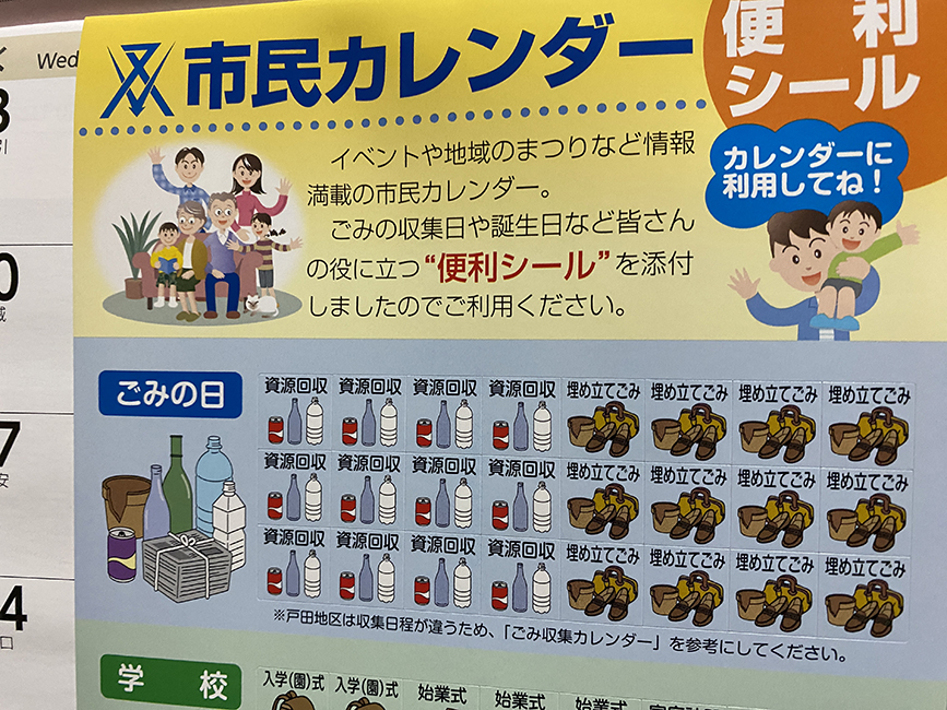 市民カレンダーには便利シールもついていて、家族の誕生日とか、自分好みにカスタマイズできるのもいいですね。家のなかの目立つところに貼っておいて、予定をシェアするのにも便利。