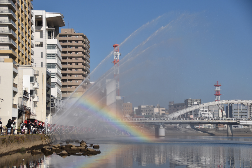 11時15分くらいになると狩野川の両岸(御成橋あたり)から一斉放水が行われ、沼津のまちに虹がかかります。