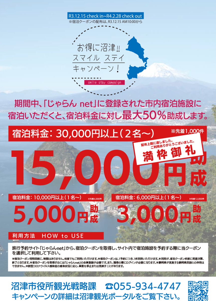 沼津市内の宿泊施設にお得に泊まれる「お得に沼津!スマイルステイキャンペーン!」がスタートしました。