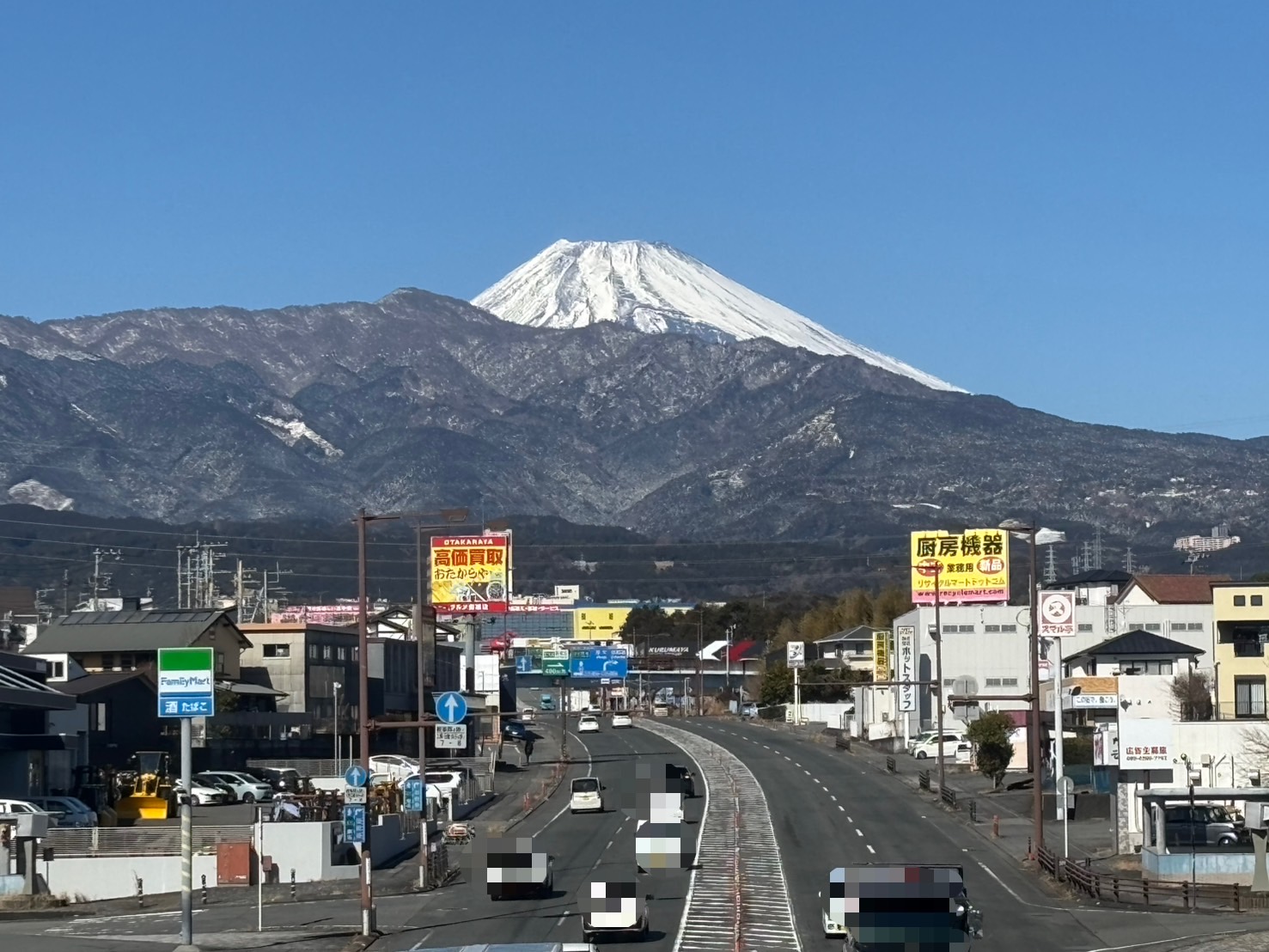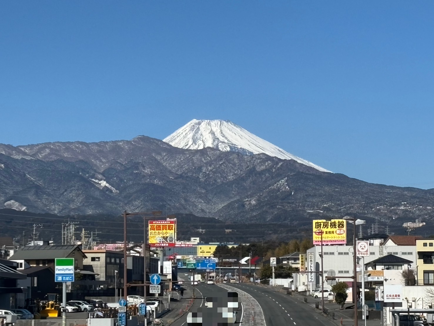 沼津のヒトは、きょうも雪の話題で盛り上がる。ぐるめ街道からの愛鷹山と富士山、めっちゃきれい。(沼津市岡一色)