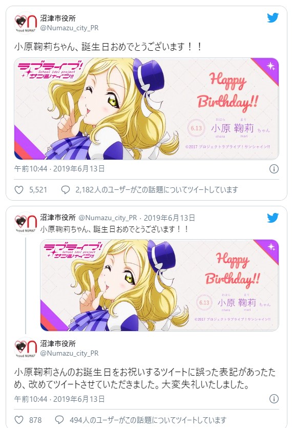 行政関連の大事な情報発信がほとんどですが、ラブライブ!サンシャイン!!の登場人物の誕生日をお祝いしたり、本田圭佑選手の誕生日をお祝いして大人気になってみたり、何かとお茶目な沼津市公式SNS。